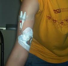 This is a port being flushed, its under the skin so no one can see it apart from a scar and a bump under the skin when its not accessed! Its so much better than PICC lines and canulars!